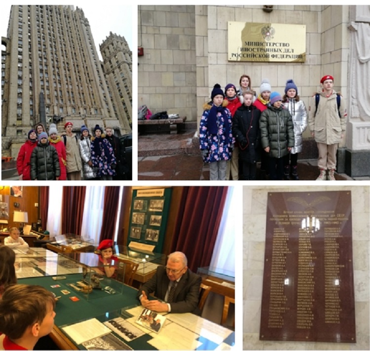 Продолжается работа юнармейцев нашей школы по увековечению памяти бойцов и командиров 6-ой Дивизии народного ополчения Дзержинского района. Поиск дополнительной информации по проекту привёл юнармейцев отряда «Память» в «Высотку на Смоленке». Так в народе называют здание Министерства иностранных дел Российской Федерации на Смоленской-Сенной площади столицы. Дело в том, что добровольцы Наркомата иностранных дел СССР пополнили ряды именно 6-ой Дивизии народного ополчения. Организовать встречу подрастающего поколения с ветеранами МИДа помогли педагог-организатор Гречишников О.И. и руководитель проекта, учитель истории Панюкова А.В.
