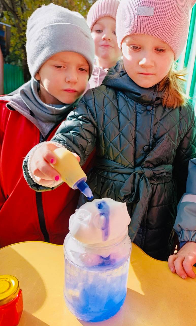 пипеткой на пену накапали окрашенную воду и осталось только наблюдать, как цветная вода пройдёт сквозь "облако" и продолжит своё путешествие ко дну банки.