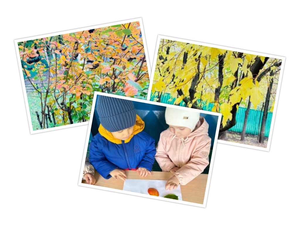 Собрали на участке опавшие листья и рассмотрели их. Увидели, что поверхность листьев бывает гладкая, а бывает мягкая, пористая. Заметили, что даже на одном кустарнике листья меняют цвет не одновременно: рядом висят и ещё совсем зелёные, и уже окрашенные багрянцем.