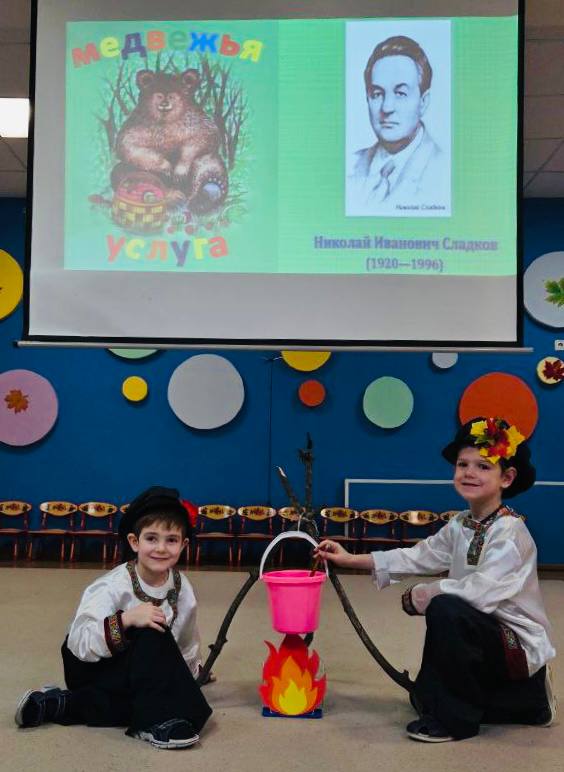 Его рассказ "Медвежья услуга" так понравился ребятам, что они решили сделать инсценировку произведения, для чего подобрали костюмы и необходимый реквизит: кажется, что вот-вот закипит-забулькает борщ из собранных кореньев...