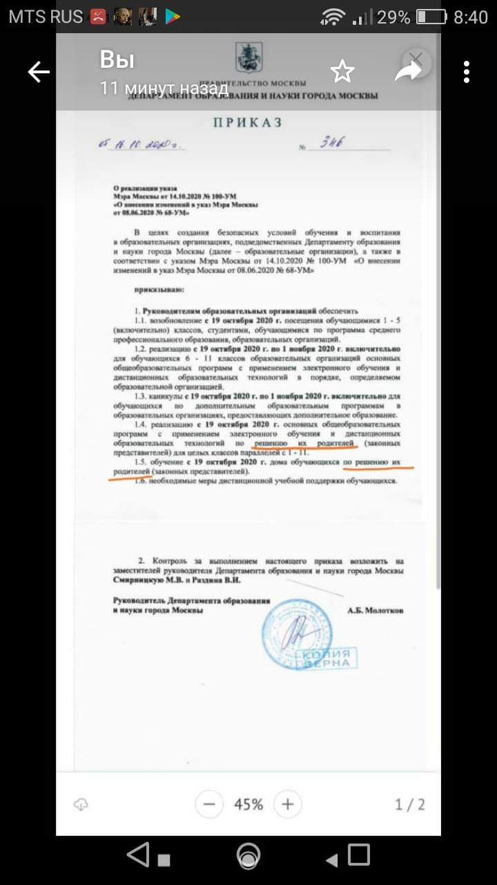 Согласно приказу ДОНМ от 16.10.2020 года № 346 образовательная организация обязана обеспечить с 19 октября 2020 года получение образования обучающимися 6-11 классов исключительно с применением электронного обучения и дистанционных образовательных технологий.