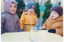 Сегодня на образовательной прогулке наши любознательные малыши проводили интереснейший эксперимент, для которого потребовались: банка, вода, мячики, стакан, пластиковая карточка.
